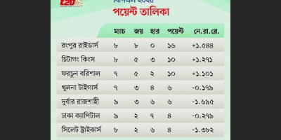 Last Updated on 10 months by zajira news স্পোর্টস ডেস্ক ডেস্ক, জাজিরা নিউজ: রংপুর রাইডার্স আট ম্যাচে আট জয় নিয়ে এই পরিসংখ্যানে সবার আগে শীর্ষ চারে থাকা নিশ্চিত করে প্লে-অফে উঠে গেছে । প্লে-অফে রংপুরের সঙ্গী হওয়ার দৌড়ে এগিয়ে আছে আরও দুটি দল চিটাগং কিংস ও ফরচুন বরিশাল। কাগজে-কলমে অবশ্য প্লে-অফের দৌড়ে টিকে আছে অন্য তিনটি দলও। ৪২ ম্যাচের প্রথম পর্বের ২৮টি ম্যাচ শেষে প্লে-অফের দৌড়ে টিকে থাকতে কোন দলকে যা করতে হব, রংপুর রাইডার্স ৮ ম্যাচে ১৬ পয়েন্ট দুর্দান্ত ফর্মে থাকা দলটির প্লে-অফ খেলা নিশ্চিত। আর দুটি ম্যাচ জিতলে তো বটেই, আর একটি ম্যাচ জিতেই শীর্ষ দুইয়ে থেকে প্রথম […]বিস্তারিত