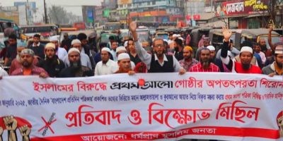 Last Updated on 9 months by zajira news অনলাইন ডেস্ক, জাজিরা নিউজ: প্রথম আলো নিষিদ্ধ ও আনিসুল হকের শাস্তির দাবিতে বরিশাল নগরীতে বিক্ষোভ মিছিল করা হয়েছে। গতকাল বিকালে বরিশাল সরকারি ব্রজমোহন (বিএম) কলেজের সামনে থেকে বিক্ষোভ মিছিল বের হয়। ধর্মপ্রাণ মুসলিম জনতার ব্যানারে করা বিক্ষোভ মিছিল নগরীর নথুল্লাবাদ বাস টার্মিনালের গোলচত্বর হয়ে জিয়া সড়কের সামনে গিয়ে শেষ হয়। সেখানে সংক্ষিপ্ত সভা হয়। বক্তব্য রাখেন আগরপুর ডিগ্রি কলেজের ইসলামি স্টাডিজ বিভাগের সহযোগী অধ্যাপক গোলাম মাহমুদ ও একই কলেজের ইংরেজি বিভাগের সহকারী অধ্যাপক মনিরুজ্জামান আসাদ। তারা আনিসুল হকের শাস্তি ও প্রথম আলো পত্রিকা বন্ধের দাবি জানান। সূ্ত্র, বাংলা নিউজ২৪.কমবিস্তারিত