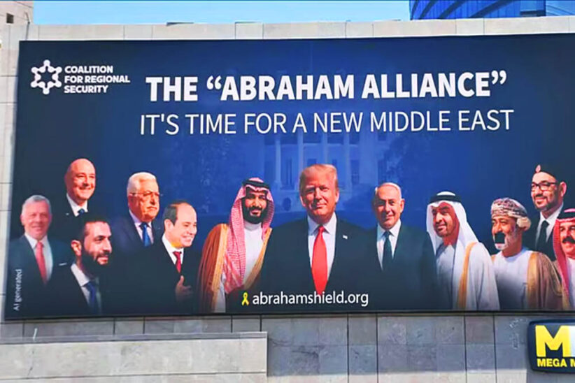 ছবির মাঝখানে শিরোনামের মতো করে লেখা ‘দ্য আব্রাহাম অ্যালায়েন্স’। তার নিচে লেখা ‘ইট ইজ টাইম ফর আ নিউ মিডল ইস্ট’। সোজা বাংলায় অর্থ দাঁড়ায়, ‘আব্রাহাম জোট: এখন সময় নতুন মধ্যপ্রাচ্যের’।