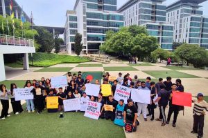 , জিওম্যাট্রিক ইউনিভার্সিটি Geometrica University সহ বেশ কয়েকটি ইউনিভার্সিটির বাংলাদেশি শিক্ষার্থীরা মানববন্ধন করেন।