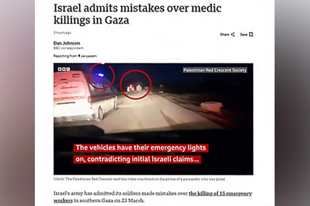 প্যালেস্টাইন রেড ক্রিসেন্ট সোসাইটি (পিআরসিএস) এ ভিডিও প্রকাশ করেছে। এতে দেখা যায়, অ্যাম্বুলেন্সসহ ওই গাড়িগুলো রাতের অন্ধকারে সম্মুখবাতি জ্বালিয়ে ও জরুরি ফ্লাশলাইট চালু রেখে ছুটে চলেছে। হঠাৎই এসব যানের ওপর গুলিবর্ষণ শুরু হয়। পিআরসিএস বলেছে, ভিডিওটি একজন প্যারামেডিকের ফোন থেকে উদ্ধার করা হয়েছে। তিনিও ওই ঘটনায় নিহত হন।