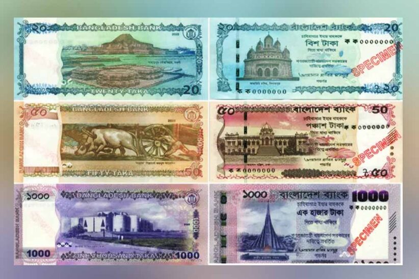 গভর্নর স্বাক্ষরিত ৫০ টাকা মূল্যমানের ব্যাংক নোটটিও শতভাগ সুতি কাগজে মুদ্রিত। এই নোটে জলছাপ হিসেবে থাকছে বেঙ্গল টাইগারের মুখ। নোটটিতে গাঢ় বাদামি রঙের আধিক্য। এটির সামনের বাঁ পাশে আহসান মঞ্জিলের ছবি। মাঝখানে ব্যাকগ্রাউন্ডে পাতা-কলিসহ প্রস্ফুটিত জাতীয় ফুল শাপলার ছবি। আর পেছনে জলছাপের ডান পাশে থাকছে শিল্পাচার্য জয়নুল আবেদিনের বিখ্যাত চিত্রকর্ম ‘সংগ্রাম’-এর ছবি। গভর্নর স্বাক্ষরিত ২০ টাকার ব্যাংক নোটটিও শতভাগ সুতি কাগজে মুদ্রিত। এটিতেও জলছাপ হিসেবে থাকছে বেঙ্গল টাইগারের মুখ। ২০ টাকার এই নোটে সবুজ রঙের আধিক্য। নোটটির সামনের বাঁ পাশে ঐতিহাসিক স্থাপনা কান্তজিউ মন্দিরের ছবি। নোটের মাঝখানে ব্যাকগ্রাউন্ডে পাতা-কলিসহ প্রস্ফুটিত জাতীয় ফুল শাপলার ছবি এবং পেছনে জলছাপের ডান পাশে থাকছে পাহাড়পুর বৌদ্ধবিহারের ছবি।