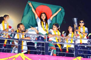 পরে মূল ফটক দিয়ে ট্রফি হাতে মঞ্চে ওঠেন অধিনায়ক। দর্শকদের করতালি ও উল্লাসে মুহূর্তটি হয়ে ওঠে উৎসবমুখর।