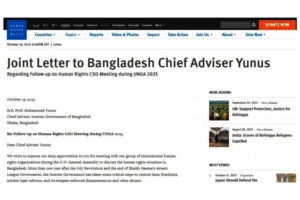 ছয় মানবাধিকার সংস্থার চিঠিতে বাংলাদেশে এনজিওবিষয়ক ব্যুরো সংস্কার ও বিদেশি তহবিলে নিয়ন্ত্রণ শিথিল করা, রোহিঙ্গাদের জোরপূর্বক প্রত্যাবাসন বন্ধ, চলাচল, জীবিকা ও শিক্ষার সুযোগ বাড়ানোর আহ্বান জানানো হয়েছে।