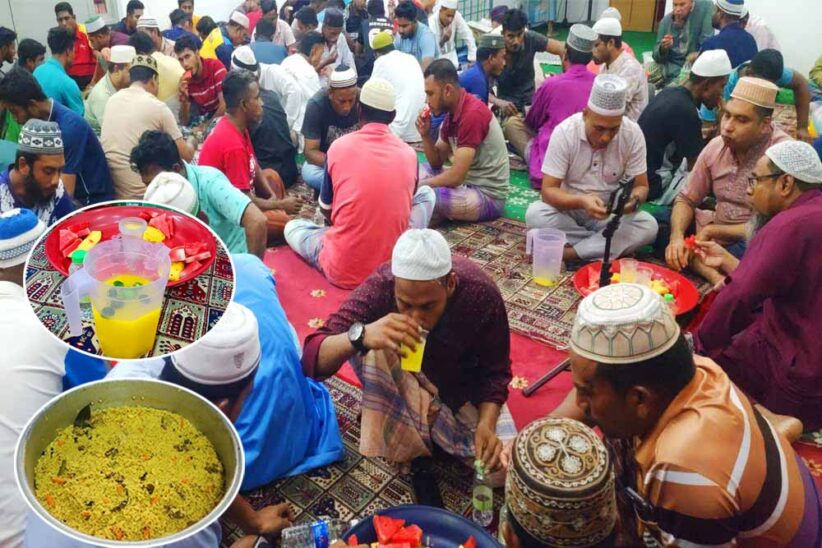খাবারের মেনুতে থাকে, বেগুনি, পিয়াজি, আলুর চপ, ছোলা, মুড়ি, খেজুর সহ নানা রকম ফলের সাথে সরবত থাকে নিয়মিত। কর্মব্যস্ততা শেষে সকলে মিলে ইফতারের আয়োজন অংশ নেন প্রবাসীরা। শেষে তারাবির নামাজ আদায় করে তারা।