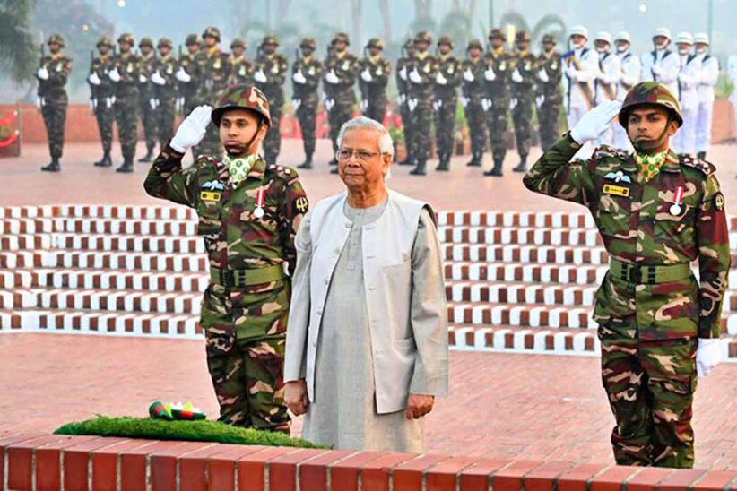 পুষ্পস্তবক অর্পণের পর ১৯৭১ সালের মহান মুক্তিযুদ্ধের বীর শহীদদের স্মৃতির প্রতি বিনম্র শ্রদ্ধা জানাতে সেখানে কিছু সময় নীরবে দাঁড়িয়ে থাকেন প্রধান উপদেষ্টা। এসময় বাংলাদেশ সেনা, নৌ ও বিমানবাহিনীর সমন্বয়ে গঠিত চৌকস দল রাষ্ট্রীয় অভিবাদন জানায়, বিউগলে বাজে করুণ সুর।