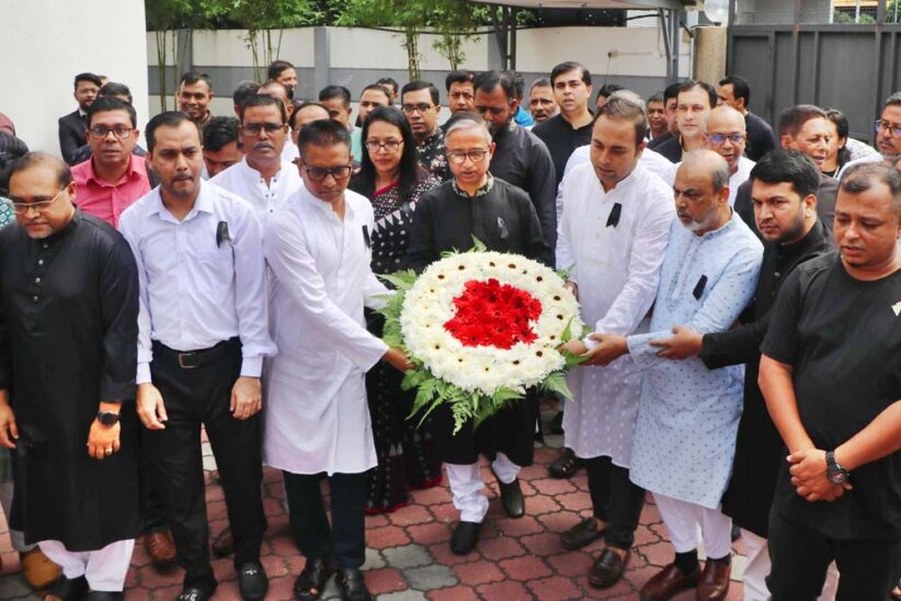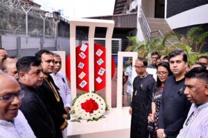 পরে মালয়েশিয়া হাইকমিশনের অস্থায়ী শহীদ মিনারে ভাষা শহীদদের প্রতি শ্রদ্ধা জানাতে পুষ্পস্তবক অর্পণ করা হয়।