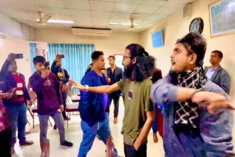 পাশ থেকে ফারাবি বলেন, ‘এত লোক সব বাইরে বসে আছে। আপনারা ফাইজলামি করছেন এখানে, নাকি?’ সাংবাদিকেরা কিছু না বললে ফারাবি আবার বলেন, ‘ভাই চিল্লাচ্ছি, কানে যাচ্ছে না কথা?’ এরপর সোয়েব তাকে থামিয়ে দিয়ে বলেন, ‘এখনই যদি বন্ধ না করেন এটা, আপনাদের সাংবাদিকদেরসহ কিন্তু আমরা তালা মেরে দেব।’