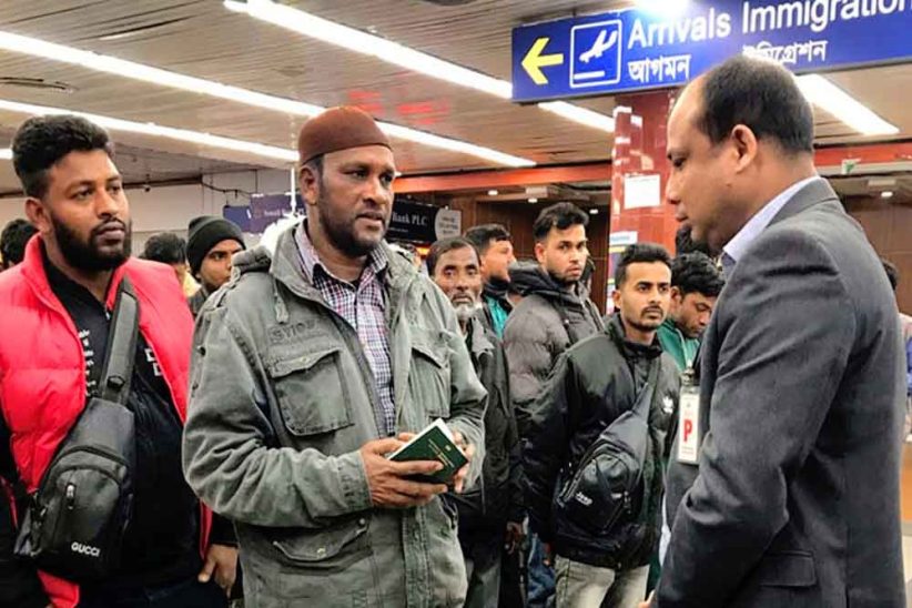 ভোরে হজরত শাহজালাল আন্তর্জাতিক বিমানবন্দরে পররাষ্ট্র মন্ত্রণালয় ও আন্তর্জাতিক অভিবাসন সংস্থার কর্মকর্তাবৃন্দ প্রত্যাবাসনকৃত অসহায় বাংলাদেশি নাগরিকদের অভ্যর্থনা জানান।